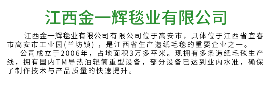 江西金一輝毯業(yè)有限公司位于高安市,具體位于江西省宜春市高安市工業(yè)園(蘭坊鎮(zhèn)) ,是江西省生產造紙毛毯的企業(yè)。